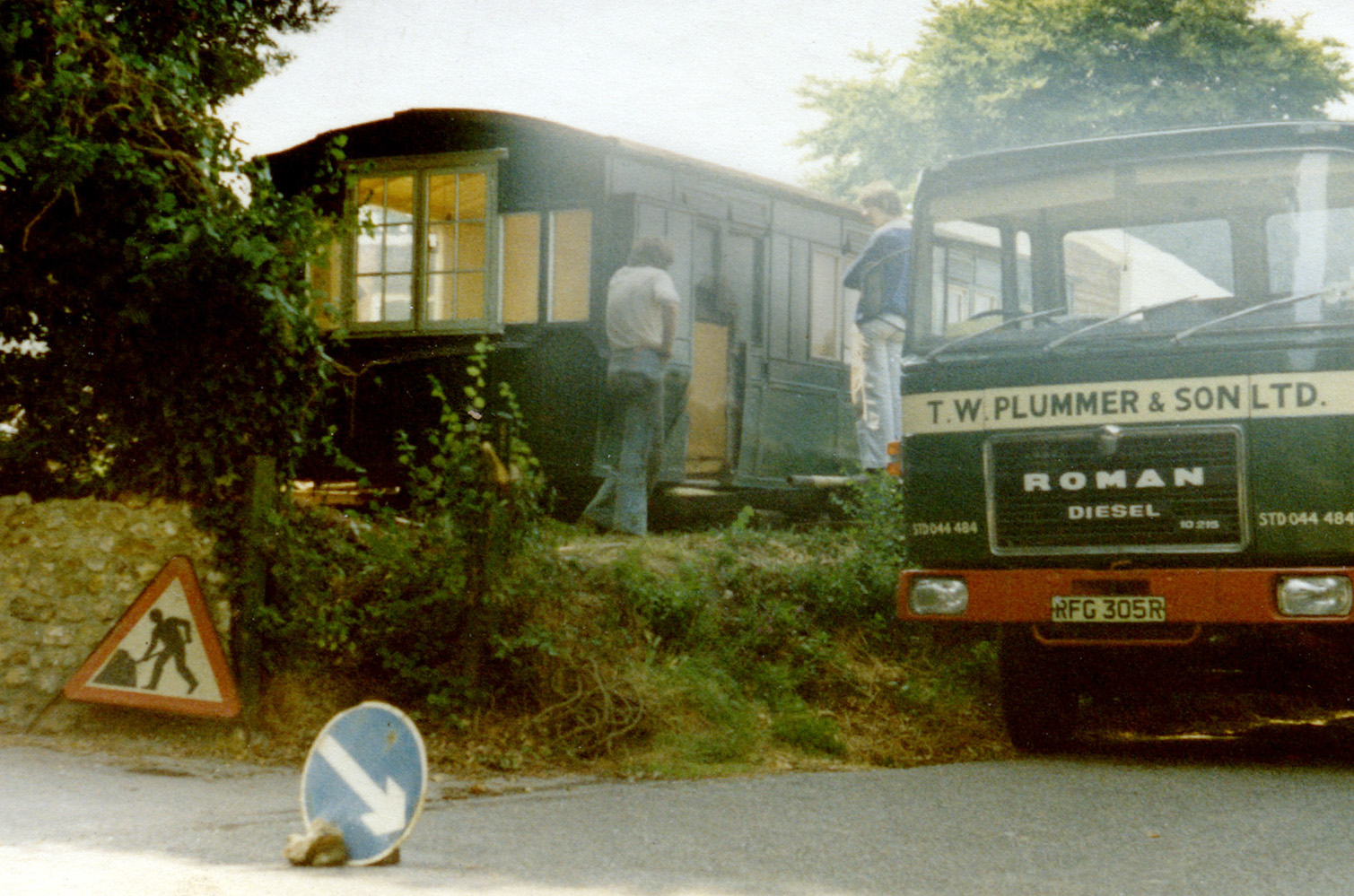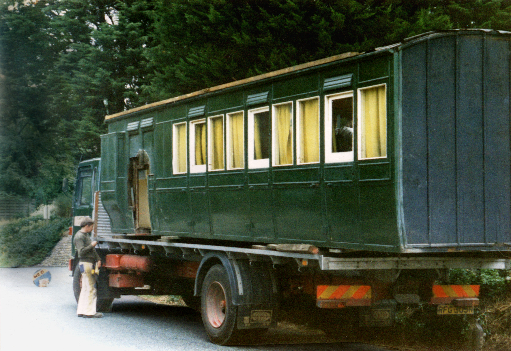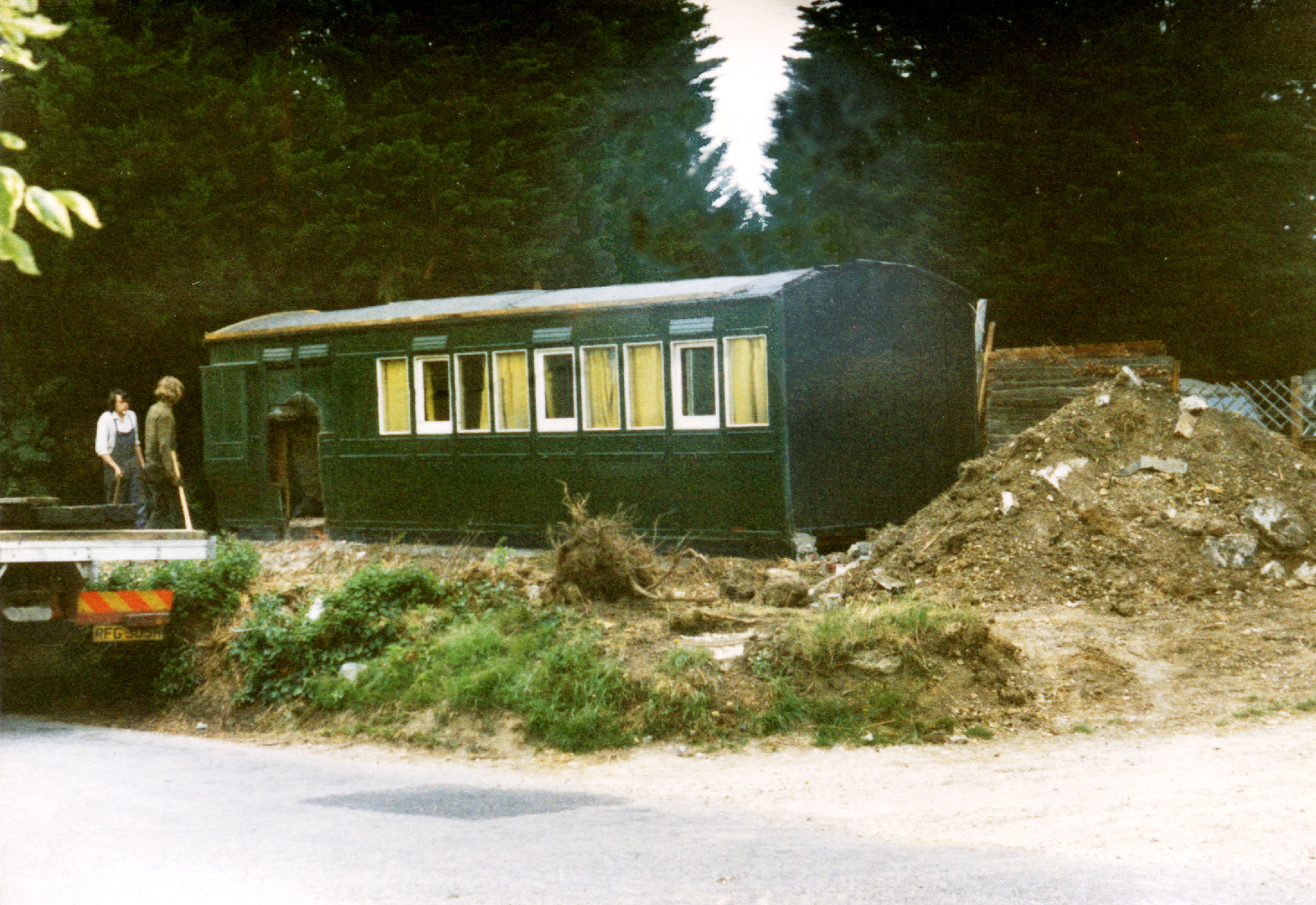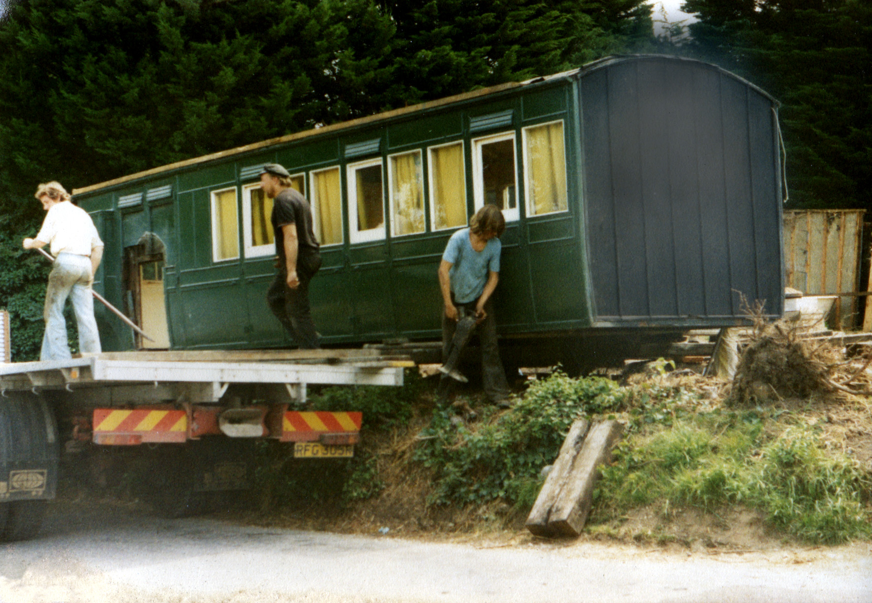 Left: The carriage body manouvered alongside the lorry. Note the large window cut in the end of the coach. The smaller windows on either side are the original guard's windows.