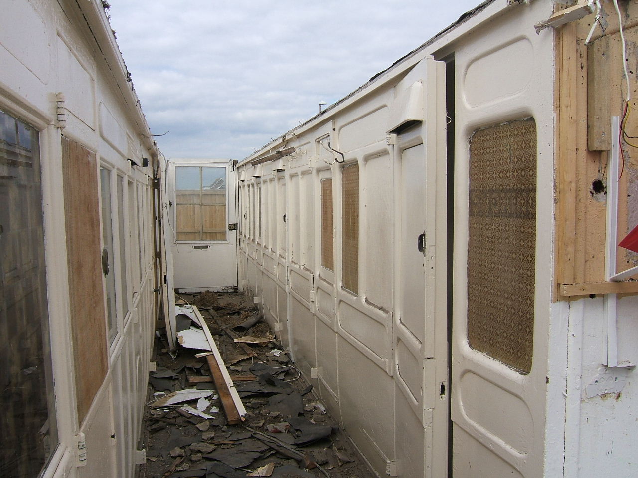 The photo on the right shows the two carriages, after removal of the overall roof, on 19th May 2008. The arrangement, with a central corridor giving access to "rooms" formed by compartments of the carriages, was very common for such bungalows.