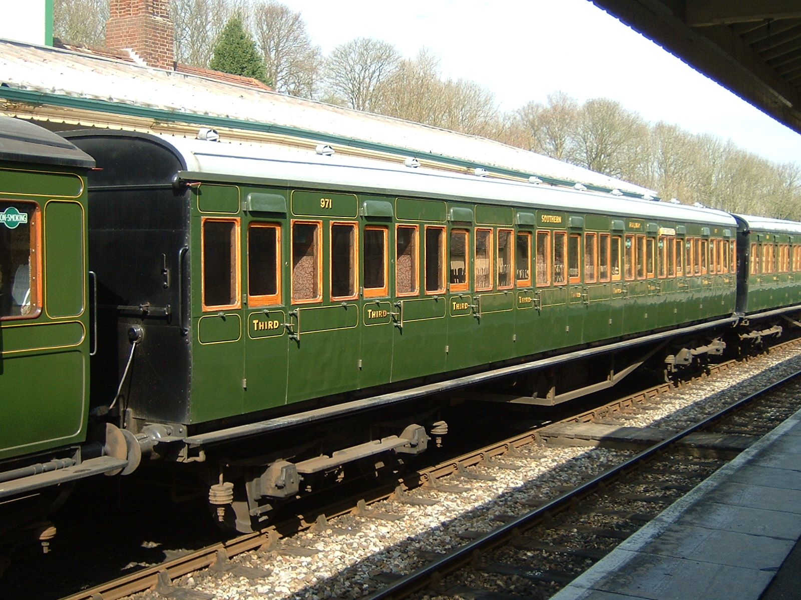 Ian Nolan's photos show, above the carriage, numbered as S971S, at Brighton on 1 November 1961, and on the left on 30 March 1963, shortly after arrival at Sheffield Park, with the "Condemned" cypher painted out. Click on the photos to see the larger versions available on Ian's Flickr pages.
