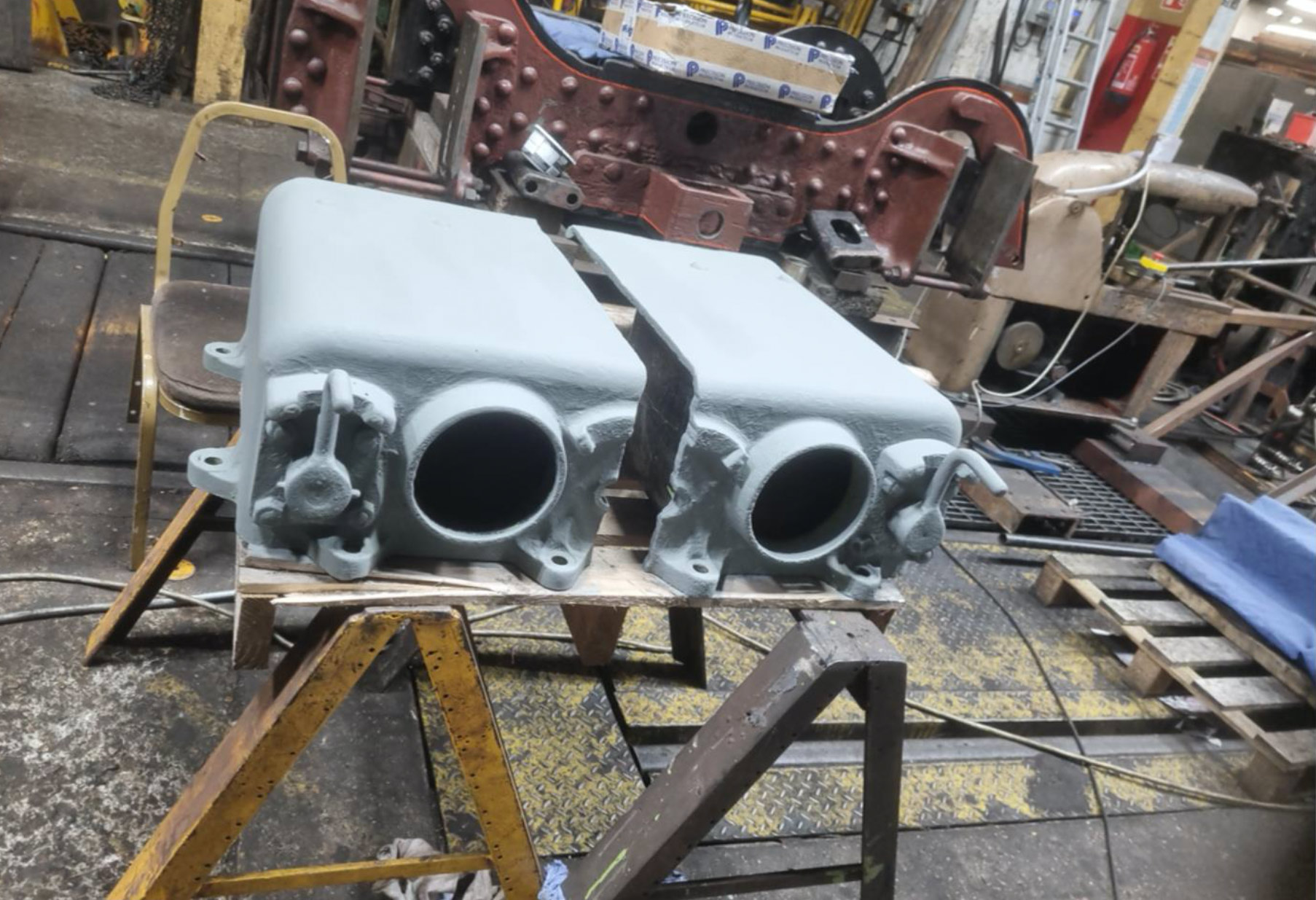 Leaky Finders now have the outer wrapper welded in place and the smoke and flue tubes ordered. All the rivets on the running plate angles are done, along with re-riveting the rear frame stretcher and boiler mounting bracket. Both frame stretchers adjacent to the driving axle have been removed, cleaned and re-attached. The new rear dragbox has been riveted in place. The new horn block wedges, slippers and associated nuts/bolts have been machined and all axle boxes undergoing crack testing.