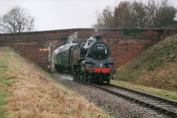 80151 seen from the foot of the embankment, heading north towards Three Arch Bridge.