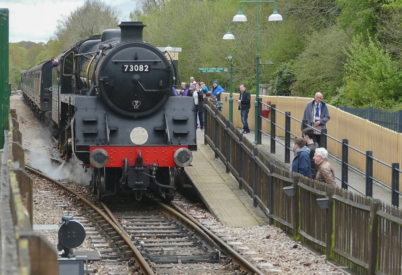 - No. 72 'Fenchurch' with its lunchtime departure from Horsted Keynes today, hauling a vintage train consisting of the Observation Car, SE&CR 100-seater and a pair of LC&DR carriages.