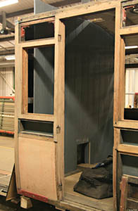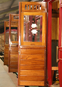 Two of the four doors from the former guard's compartment are at an advanced state of repair; they are also being panelled internally in teak so as to match those in the remainder of the coach. The repaired bottom-side in the door opening on the east side has been rebated and had the original steel tread-plates re-fitted.