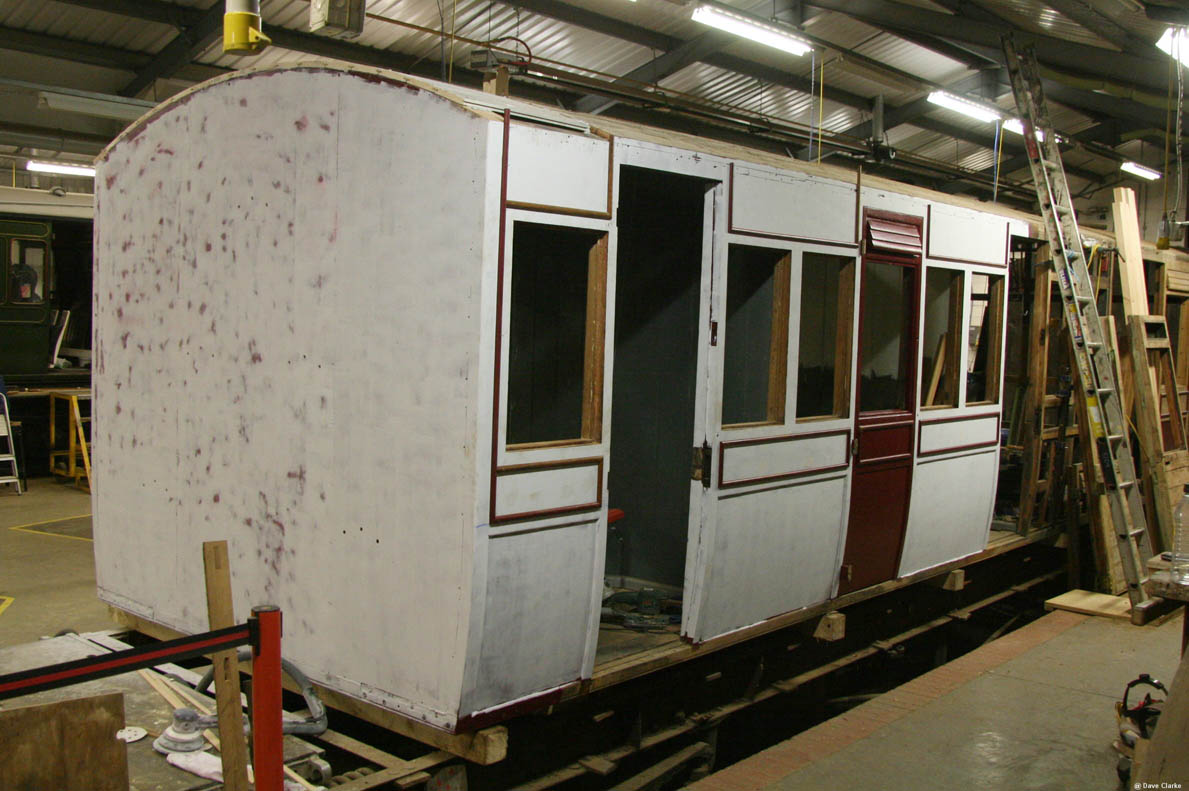 More photos from Dave Clarke, showing that the carriage has now moved into main workshop at Horsted Keynes.