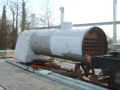 In readiness for the new building the boiler has been moved and we took the opportunity to give it a bit of a washout using a pressure washer. A good amount of scale was removed. On further inspection the boiler appears to be in remarkably good order. There are a few marks in the corners of the inner firebox tubeplate that will need a bit of caulking and we will probably take out and replace all the foundation ring rivets. We have not looked in any detail as yet at the stays. On closer inspection however, above the foundation ring in the area where fire irons usually damage the copper plate, we found the original plate numbers stamped in the copper. In fact these were easily legible in all the inner firebox copper plates. This is most unusual and it looks as though during its spell in industry it was not used with a fire in it. Further to this, when we cut the old wasted smokebox off of the boiler there was an external blower valve and shut off valve for the mechanical lubricator atomisers that we saved. This was dismantled and bead blasted. As expected various numbers were found stamped in this component. There were three legible numbers, 3287; 4440 & 3299 plus one questionable that looked like 3363? These are possible engine numbers and in fact all other than the last relate to C1 class large Ivatt Atlantic's. As number 3287 was stamped over 3363 this as in all archaeological dig scenarios is taken to be of a later date than the number underneath. Whilst at York on our last visit I took the opportunity to carry out some research. According to Yeadon's register locomotive number 3287 was fitted with boiler number 9359. (Unfortunately we do not have the boiler number plate, or the Doncaster boiler records that give the plate numbers) From the Doncaster boiler order book this boiler was ordered new in June 1941 under boiler order number 880 (a batch of 5 boilers) and was recorded as fitted to the locomotive on 14/8/1943. This engine was then condemned and withdrawn for scrap on 6/10/1945. We believe that the boiler was put into good order by Doncaster works prior to being sold on to outside industry. These facts if correct may account for the condition of this boiler today. (Locomotive number 3299 was fitted with boiler number 8408 from loco number 4402 on 8/8/1942. It is thought that this boiler would be unlikely to be in such good condition as ours even though withdrawn a little earlier in 1945). Also while at York we obtained copies of any applicable Ivatt large Atlantic drawings. I was hoping to obtain detailed valve gear drawings upon which I could base the ones for our project, but there are very few applicable drawings of any kind for the C1 Atlantic's. We did however get copies of a small number of boiler and firebox drawings that will be useful later on especially when dealing with the boiler insurance company.