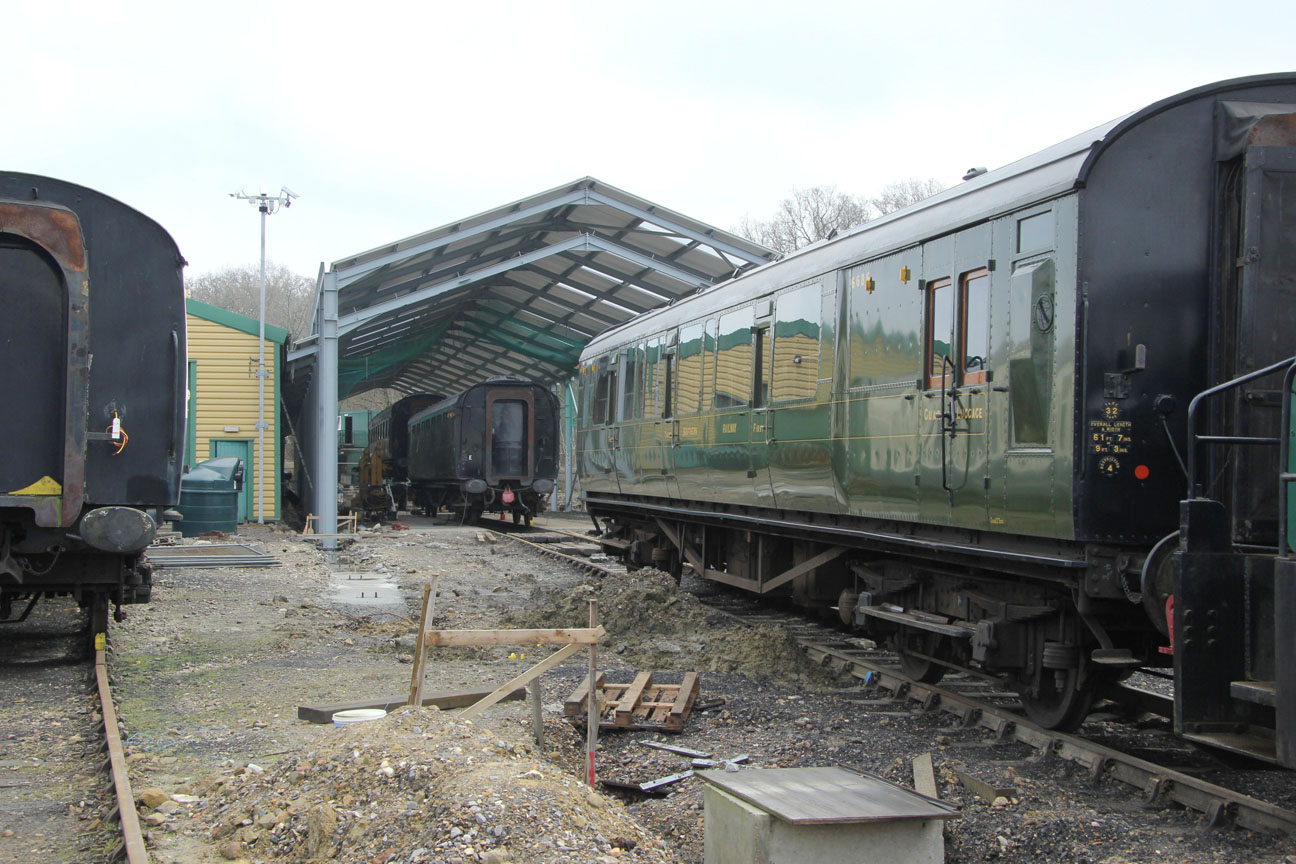 After a slow start to the foundations due to the appalling weather earlier in the year, we now have the steel structure up and roof over the maintenance pit and jacks. The first section of steel structure was also erected at the North end of the 4-road storage shed, just in time to be viewed by public and shareholders alike, as part of tours of the C&W during the Shareholders' Weekend. It is hoped that the next month or two (weather permitting) will see the completion of stage 1 of the project, for which funds were received from huge numbers of very generous donors in response to the 'Cash for Cover' fundraising campaign, after which second-hand track can start to be laid into the building to get the first carriages under cover.The Rolling Stock Sub-committee is considering what carriages can be accommodated, and how to evaluate criteria to select the few which can't be accommodated. It will probably be possible to fit 22 or 23 carriages in the storage shed, so it looks as though only 4 or 5 pre-nationalisation carriages will be left outside under tarpaulins; they could be ones which are already so far gone that further deterioration will make little difference, or ones in very good condition, which will deteriorate very little under a tarpaulin, since there is no rot present.