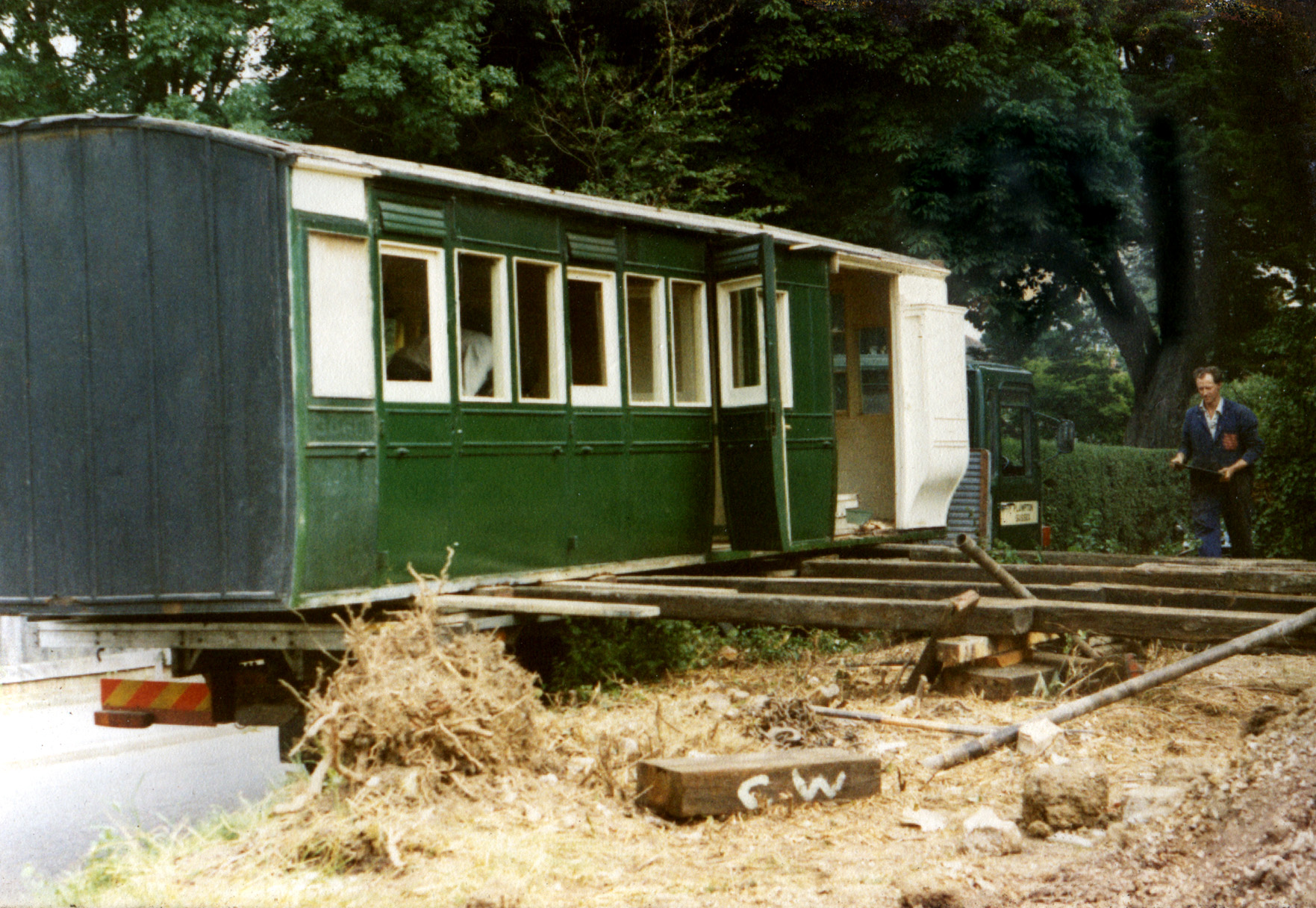 Left: The carriage body manouvered alongside the lorry. Note the large window cut in the end of the coach. The smaller windows on either side are the original guard's windows.