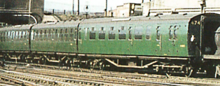 Photo, Right: Either 4227 or 4228, one of the brake coaches of Set 474 at Ramsgate, March 1959, still in its original malachite green - see details above (photographer unknown)