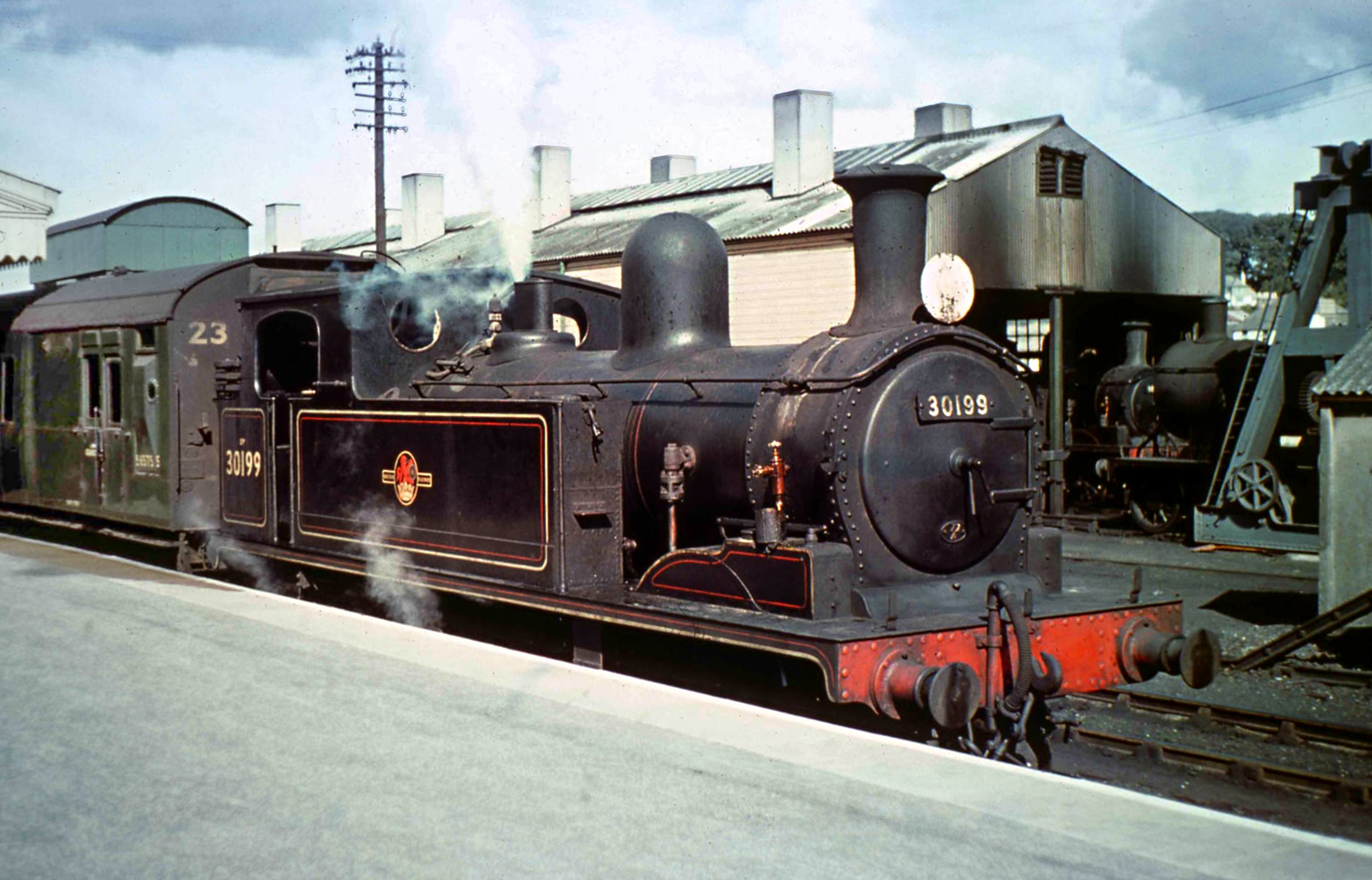 S.C.Nash's photo shows 6575 as the rear coach behind Beattie well tank 30586 skirting the Camel Estuary with the 11.55 service from Padstow to Wadebridge on 2 July 1954. The later photo, from the collection of Peter Quilley shows the coach after being repainted into BR(S) green, behind Adams O2-class 30199 at Wadebridge.